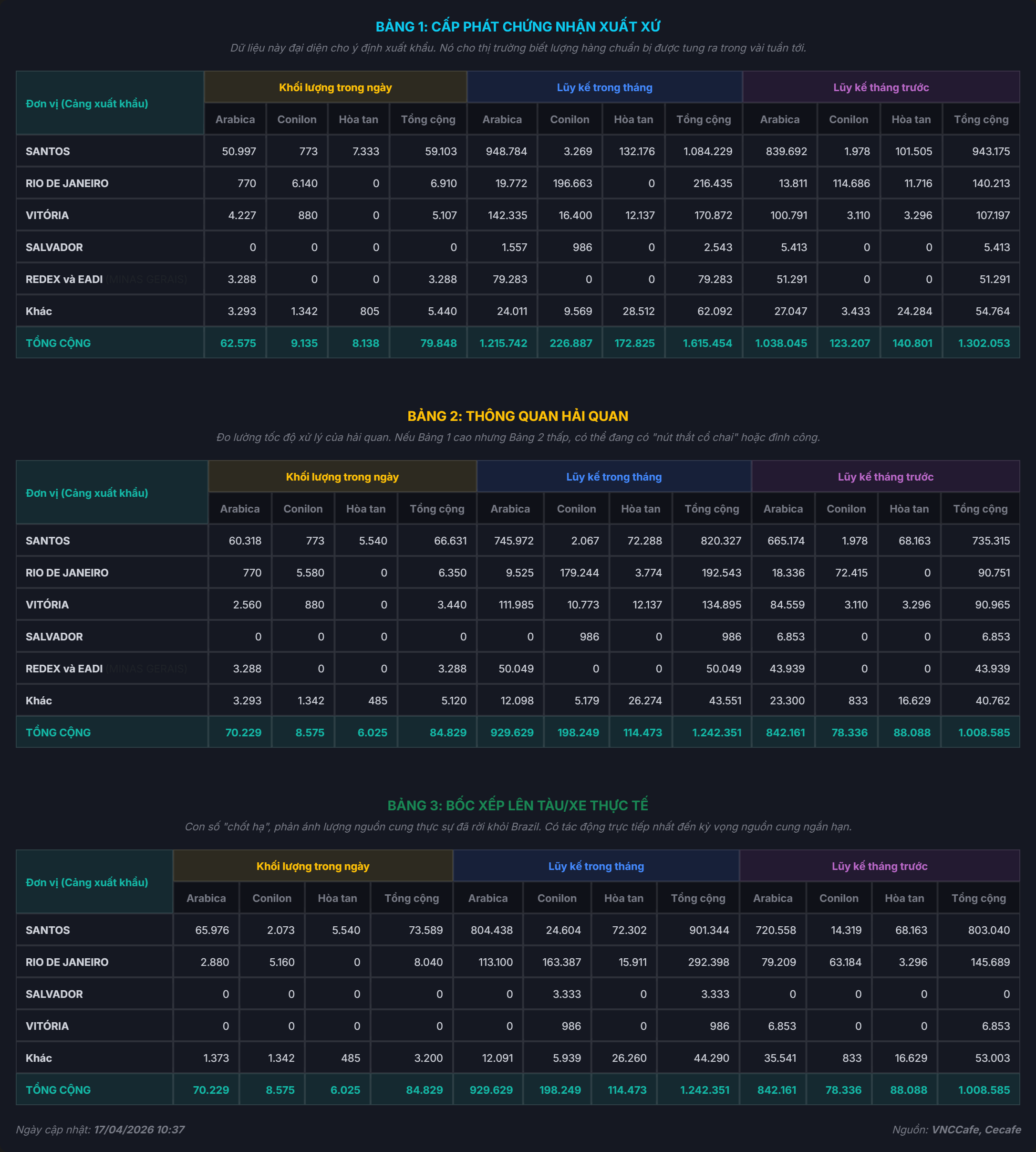 Báo cáo Cecafe cập nhật ngày 13/04 ghi nhận lũy kế thông quan tháng 4 đạt 1.242.351 bao, tăng 23% so với tháng trước. Toàn bộ lượng hàng vừa thông quan đã được bốc xếp lên tàu ngay lập tức một dấu hiệu cho thấy nút thắt hải quan tại Santos và các cảng phụ cận đã được tháo gỡ phần lớn. Riêng Arabica chiếm 735.832 bao trong tổng lũy kế thông quan, với Santos xử lý 644.560 bao, dứt điểm tình trạng ùn ứ kéo dài từ đầu tháng.