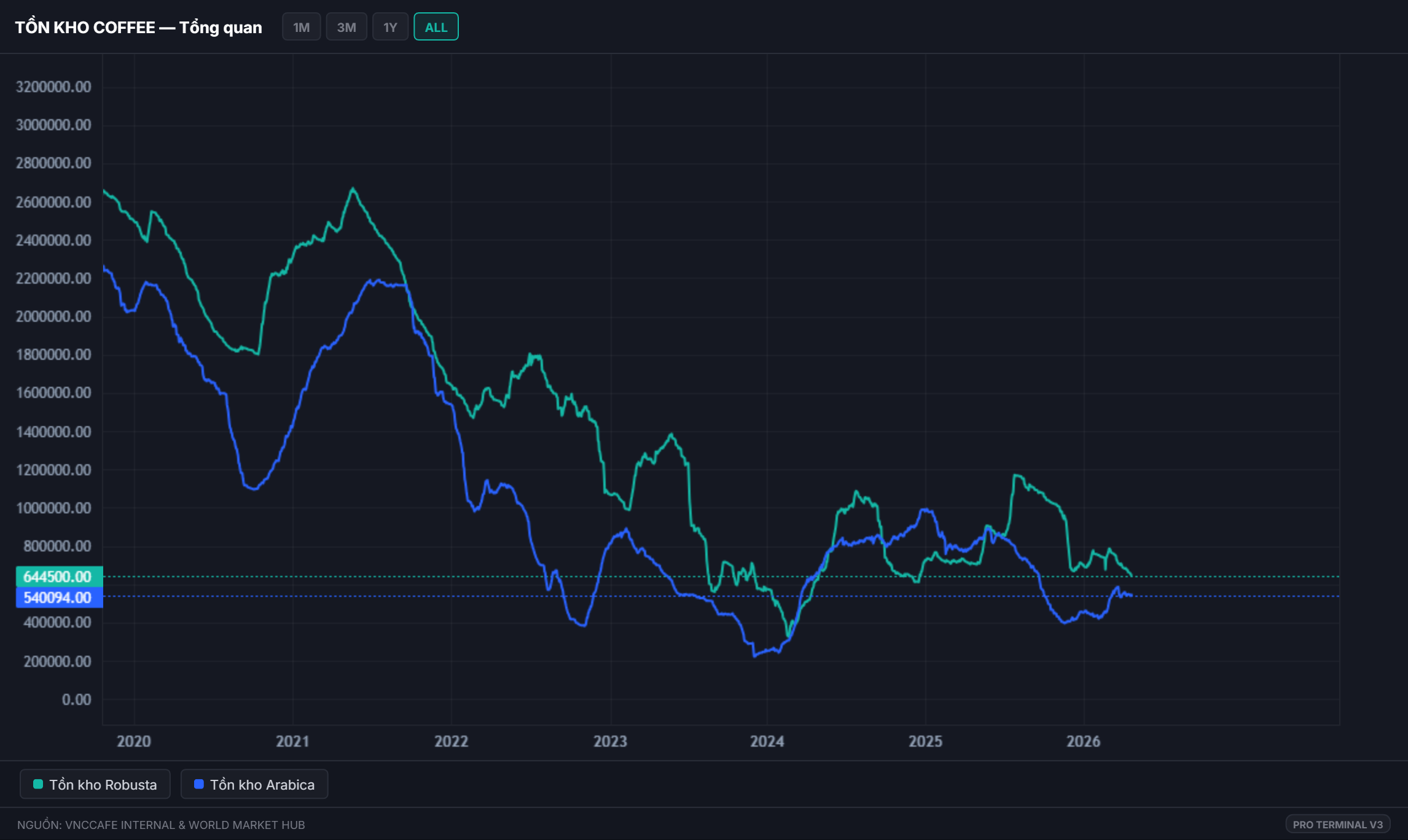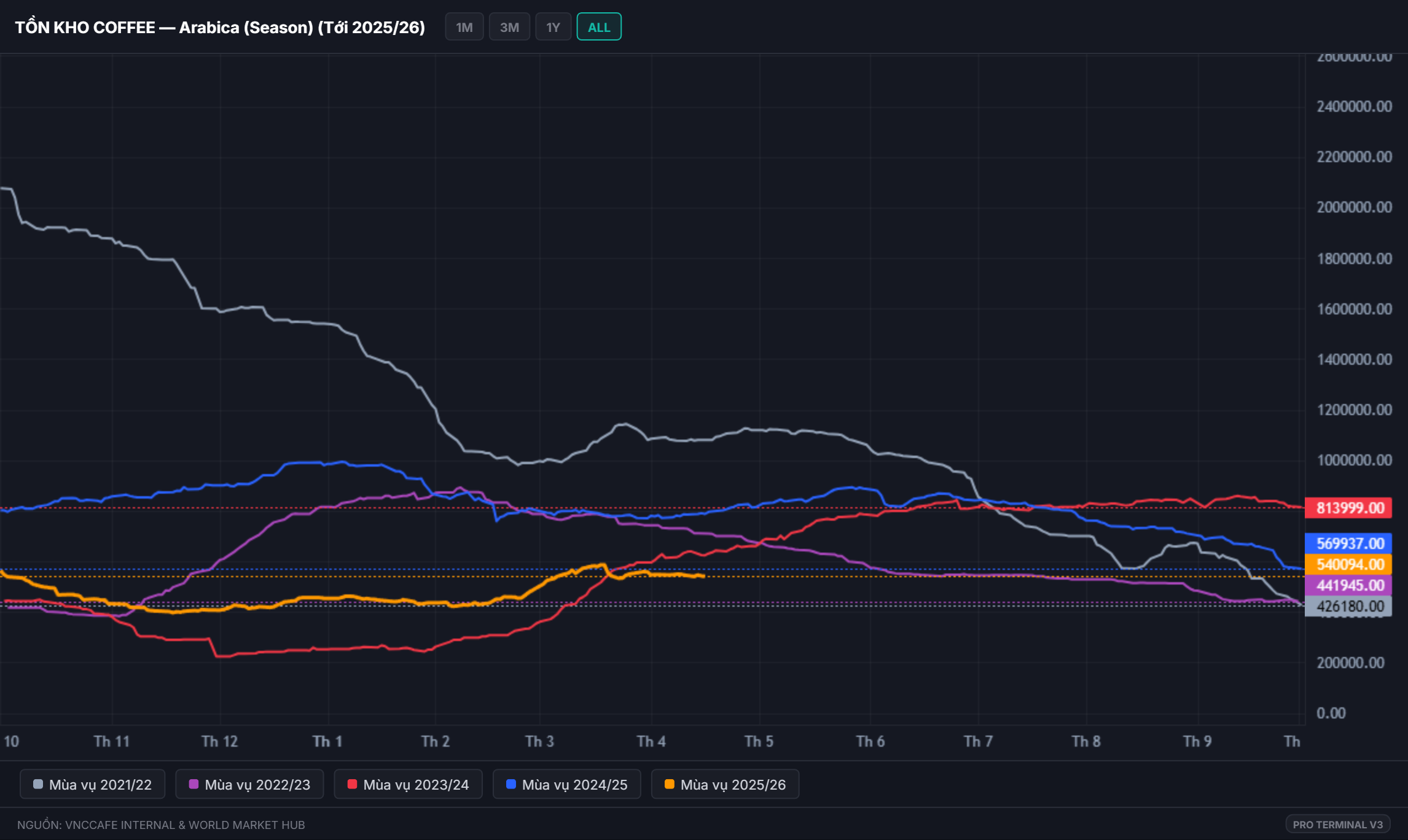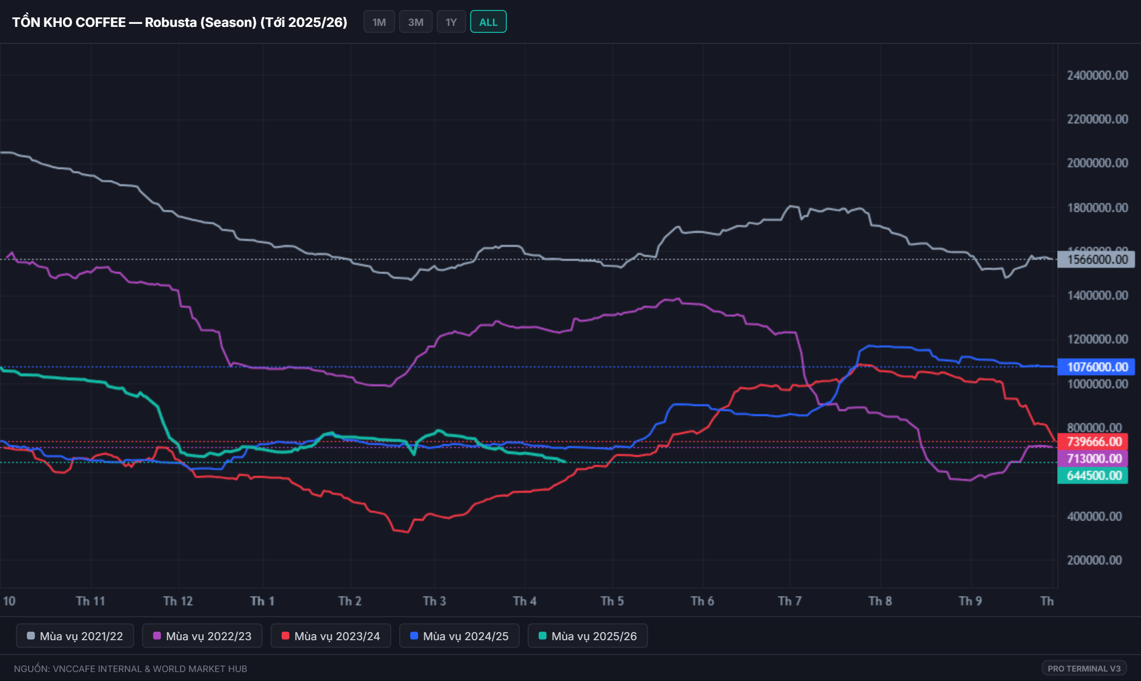 Nhưng tồn kho trên sàn ICE hầu như không nhúc nhích. Arabica certified stocks chỉ ở mức khoảng 540.000 bao, gần vùng thấp nhất kể từ cuối 2023 thời điểm mà tồn kho từng chạm đáy 224.000 bao và giá chỉ ở 179 cent/lb. Robusta certified stocks cũng bám vùng 644.500 bao. Biểu đồ tồn kho theo mùa vụ cho bức tranh rõ hơn: Arabica niên vụ 2025/26 đang ở mức thấp nhất trong năm mùa vụ so sánh, còn Robusta 2025/26 vận động gần sát quỹ đạo của niên vụ 2023/24 niên vụ mà sau đó giá rally lên vùng đỉnh lịch sử.