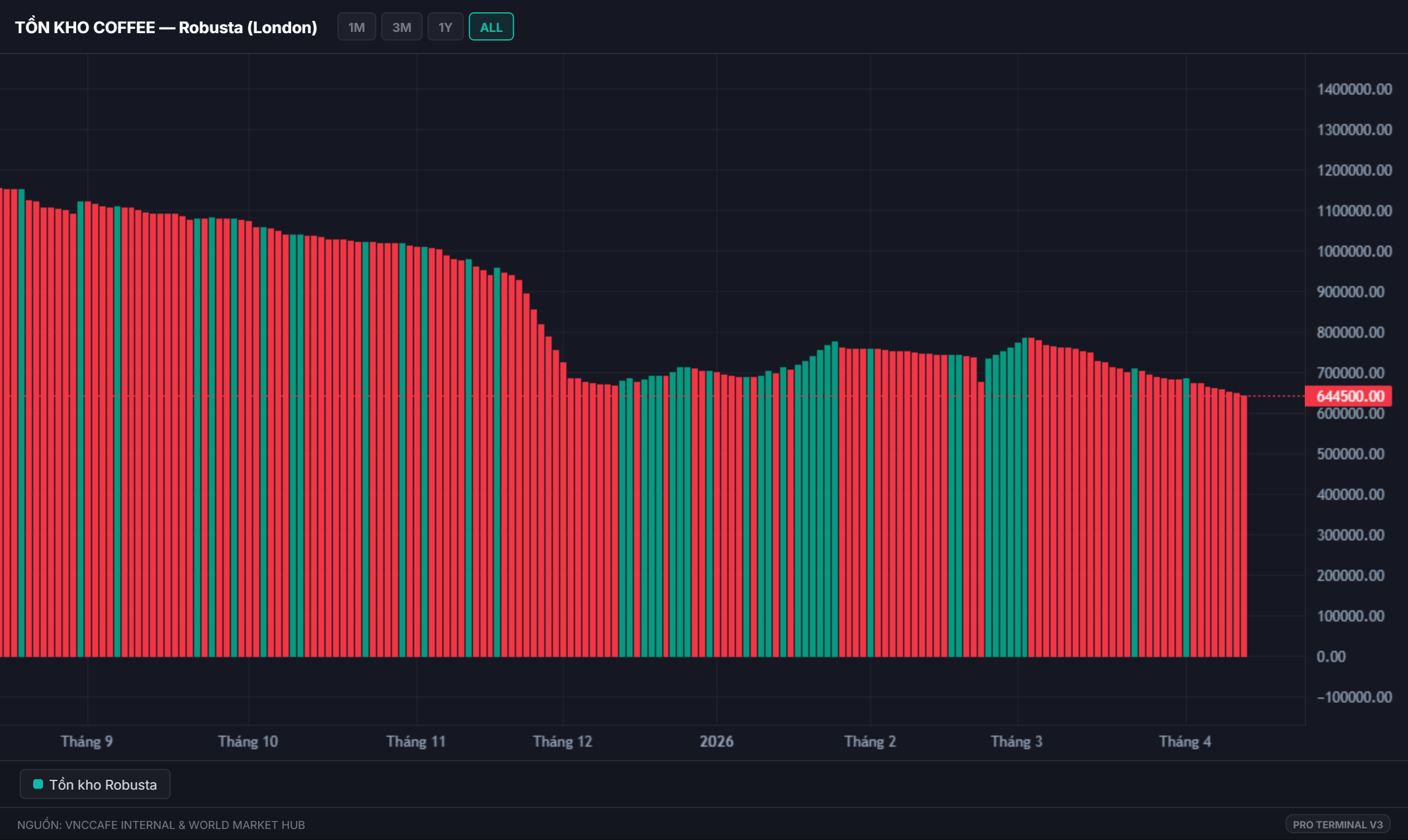 Nói cách khác, hàng Brazil xuất ra đang được hấp thu gần như toàn bộ bởi các hợp đồng thương mại ký trước đó. Sau giai đoạn Q1 tắc nghẽn với xuất khẩu giảm 21%, nhiều hợp đồng bị trễ hàng nhịp xả tháng 4 thực chất đang trả nợ giao hàng cũ, không tạo ra nguồn cung dư để ai đó đưa vào kho sàn. Với Robusta, tín hiệu còn rõ hơn: Brazil đang thu hoạch vụ mới từ cuối tháng 3, Việt Nam xuất khẩu Robusta tháng 1 tăng 73%, nhưng kho Robusta ICE vẫn giảm nghĩa là hàng mới thu hoạch và hàng xuất khẩu đang bị thị trường hấp thu ngay lập tức, không kịp tích lũy.