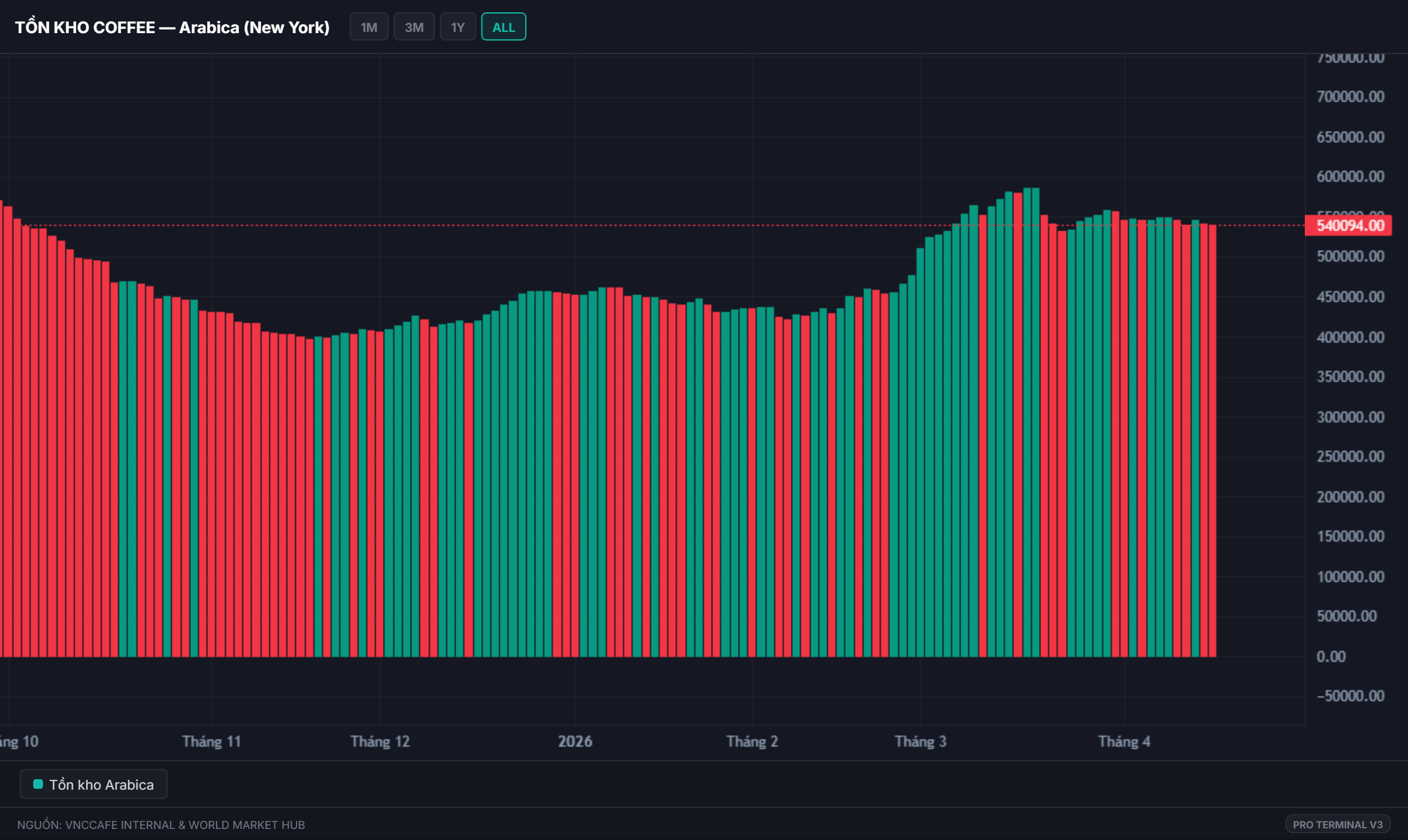 Arabica kỳ hạn đang giao dịch quanh vùng 296 - 310 cent/lb giữa tháng 4, giảm hơn 16% so với cùng kỳ năm trước và cách xa đỉnh 424 cent/lb thiết lập hồi tháng 9/2025. Mặt bằng giá thấp hơn phản ánh kỳ vọng ngày càng lớn về vụ thu hoạch kỷ lục sắp tới tại Brazil. Nhưng bên dưới bề mặt giá, một mâu thuẫn cơ bản đang hình thành: dữ liệu xuất khẩu cho thấy nguồn cung đang chảy nhanh hơn, trong khi dữ liệu tồn kho cho thấy lượng đệm an toàn vẫn gần như không cải thiện. Cách thị trường giải quyết mâu thuẫn này sẽ định hình xu hướng giá trong quý tới.
